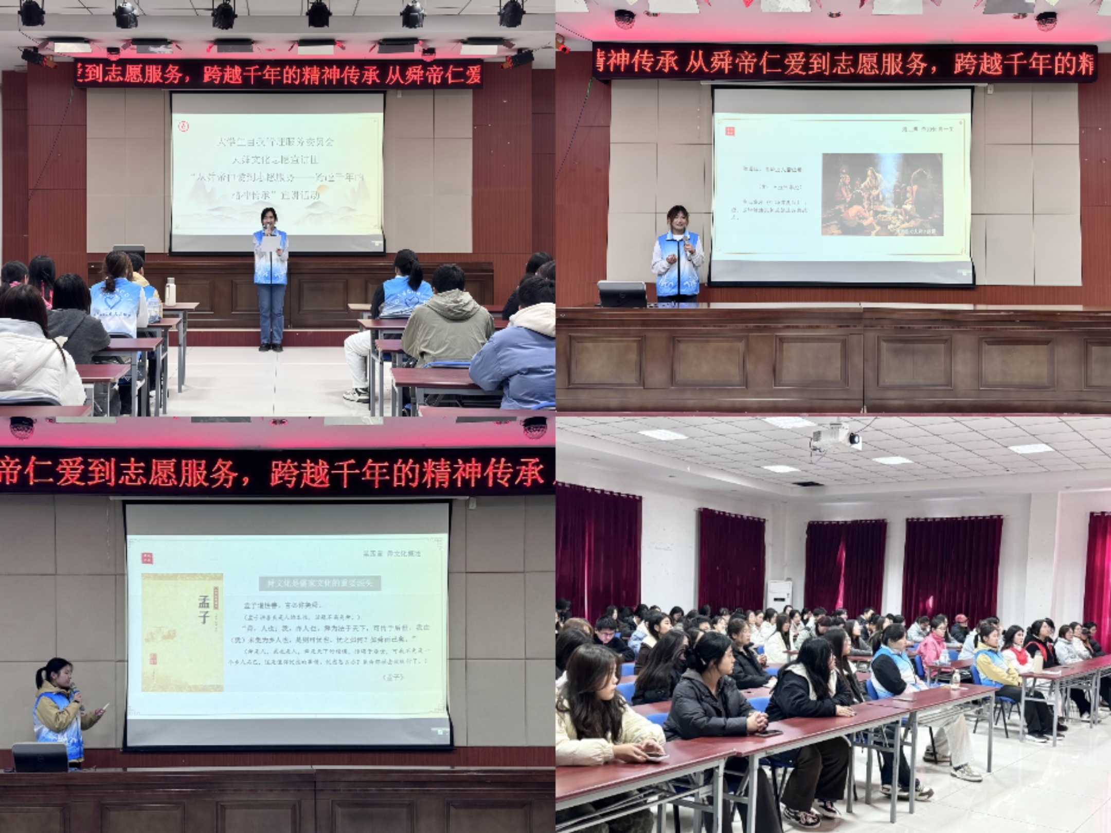宣讲过程中,志愿者从“舜的传奇一生”“舜文化概述”和“被遗忘的历史”三个方面绘声绘色地讲述了舜传奇的一生,让在场学生深切感悟到了大舜“克勤于邦,克俭于家”的实干精神,激发了其在志愿岗位上脚踏实地、无私奉献的服务热情。随后志愿者将舜文化的核心精神“仁”“和”与雷锋精神中的“奉献”“互助”相结合,引导成员们认识到志愿服务不仅是具体行动,也是对传统“仁爱”思想的现代诠释。宣讲结束后,与会同学纷纷表示,未来要将舜文化的深厚内涵与雷锋精神融入到日常服务中,以实际行动传承、弘扬大舜文化和雷锋精神,诠释新时代青年的责任与担当。