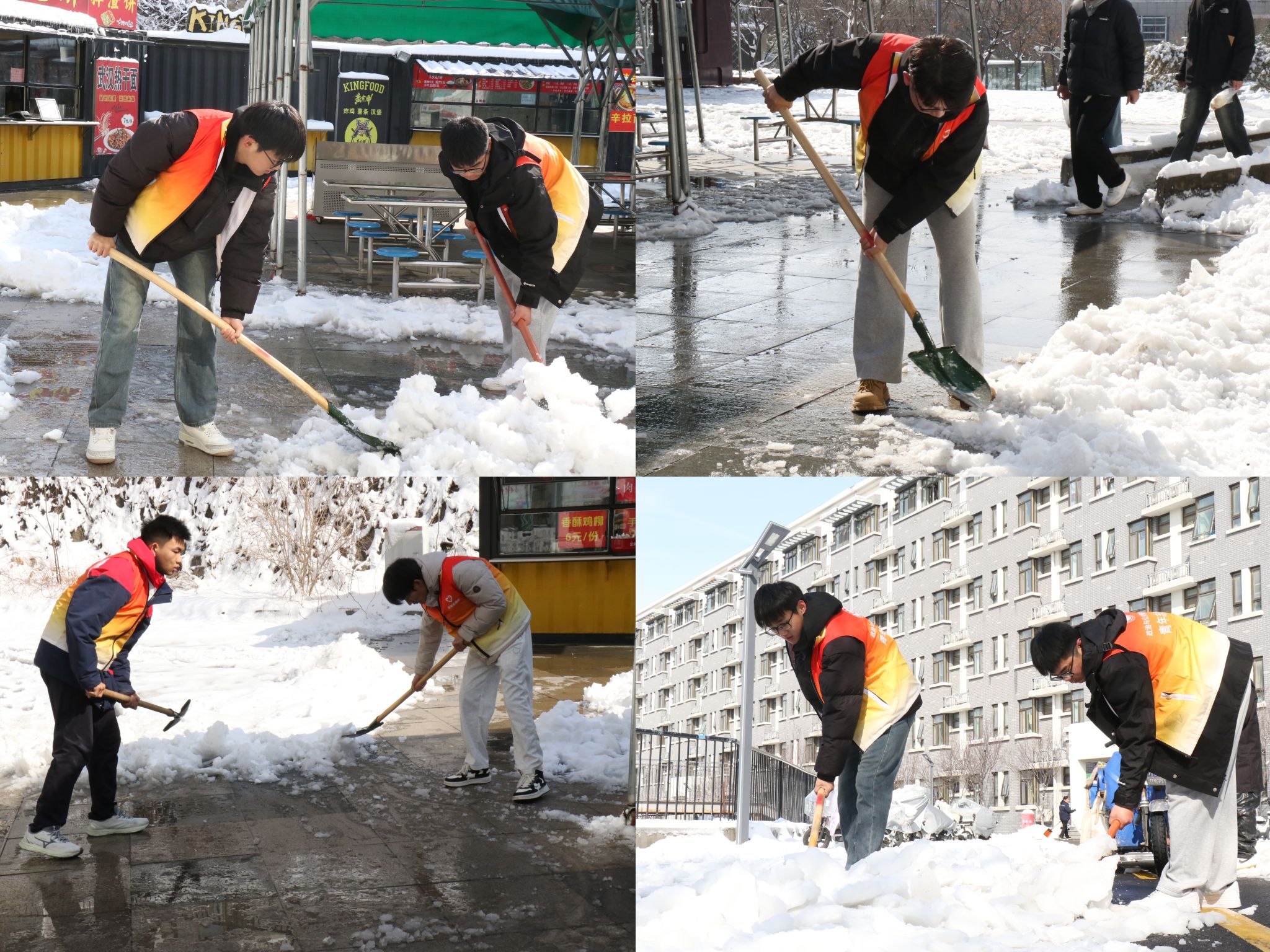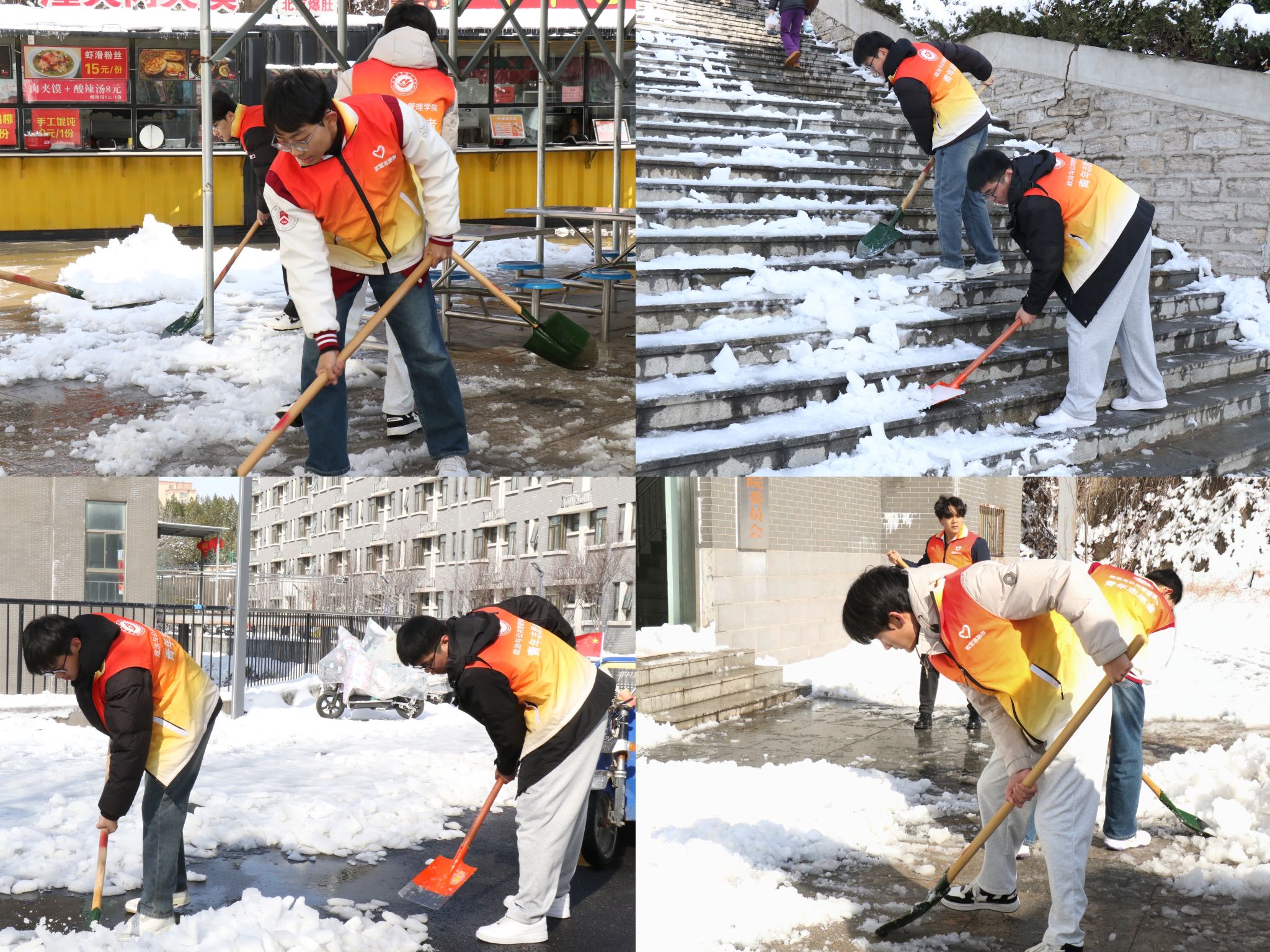 雪落无声,校园有情。学院学生组织积极响应扫雪除冰号召,通过线上线下发布招募令,学生党员、共青团员、班级骨干带头报名,在较短时间内迅速组织起一支“扫雪志愿先锋队“。上午8点,志愿者们身穿红色志愿马甲,手持铁锹、雪铲等除雪工具,在队长的带领下奔赴宿舍楼区主干道、教学楼、图书馆、学生食堂等地开展除雪工作。