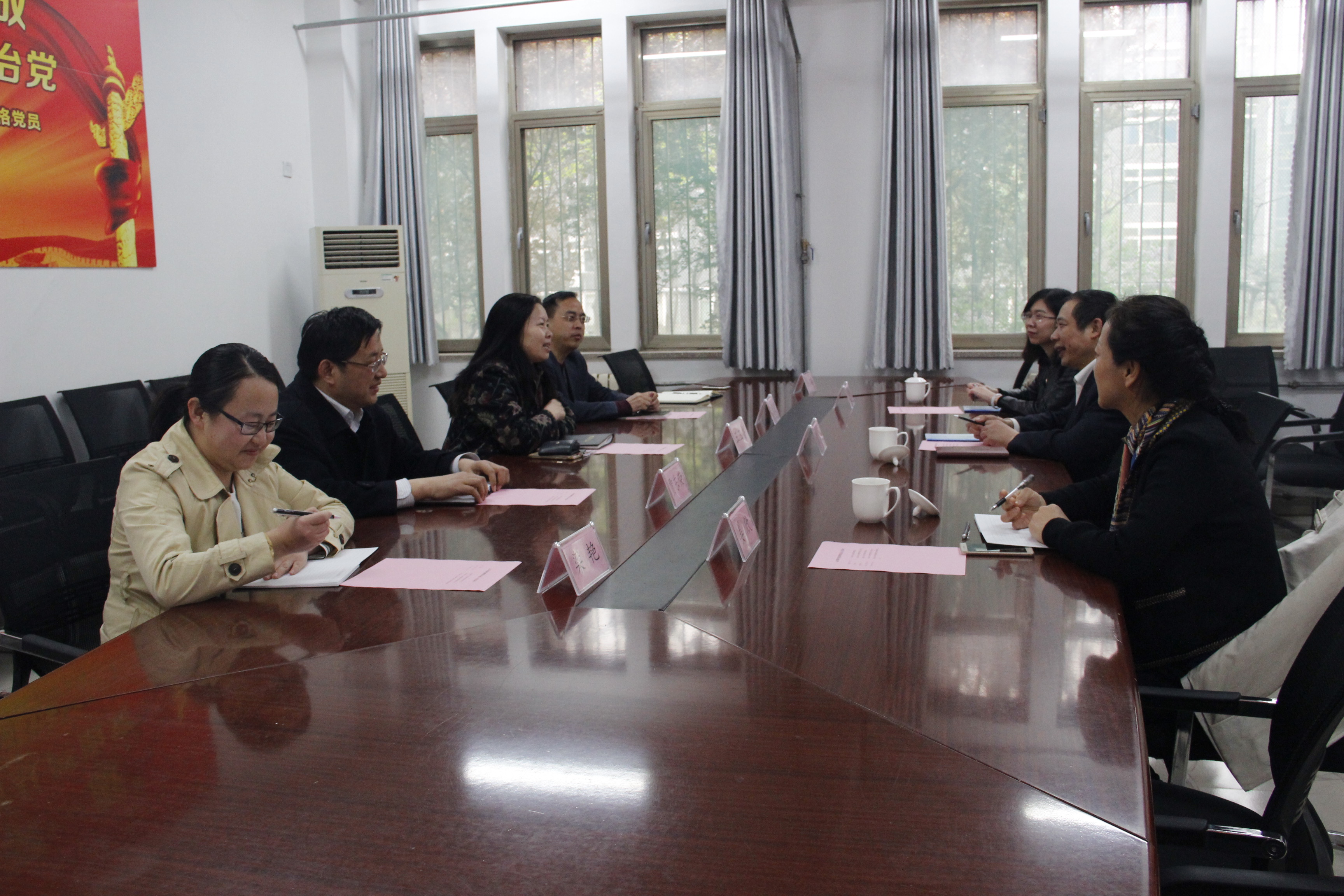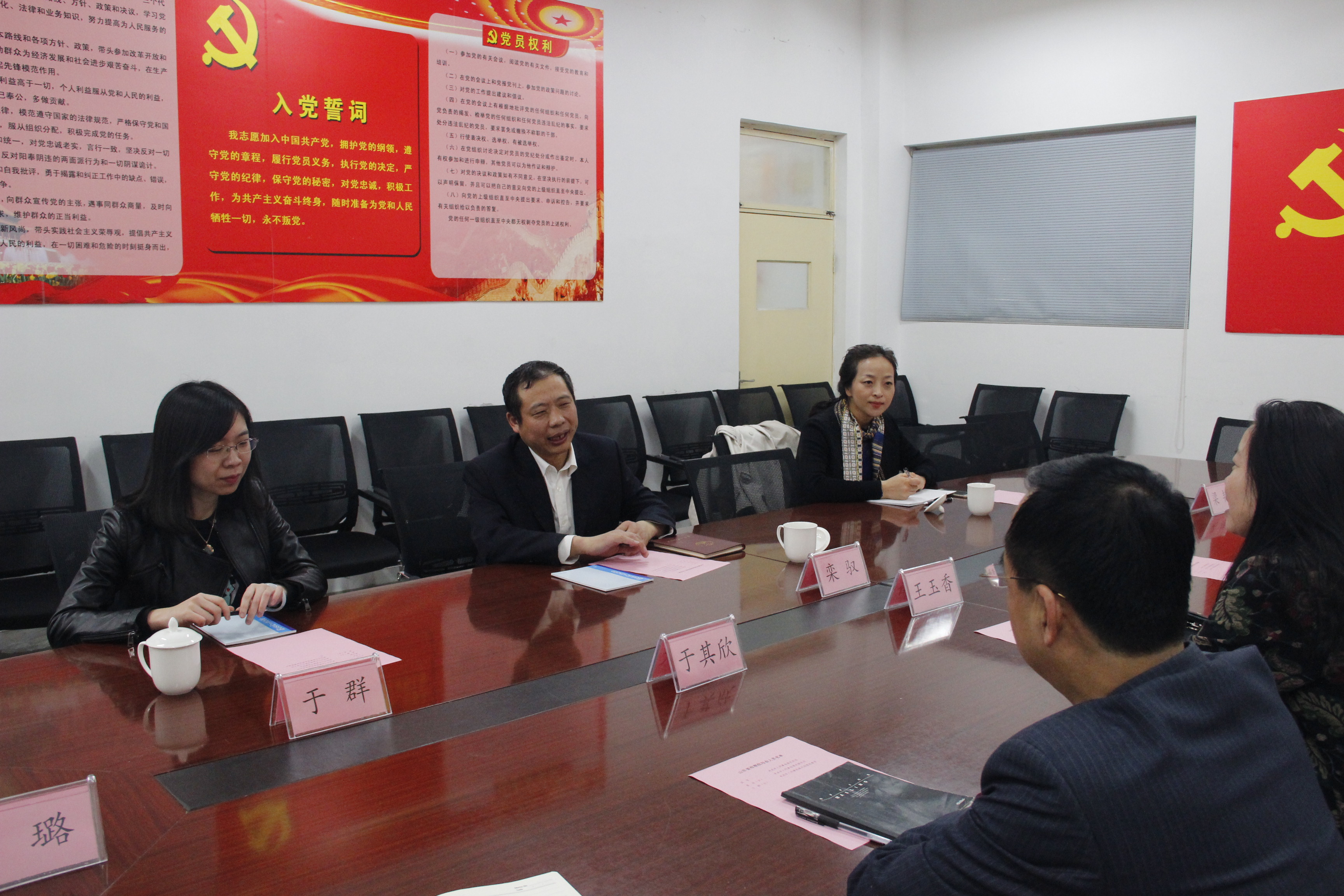 4月11日,山东省人民检察院未成年人刑事检察处处长栾驭、副处长姜欣和助理检察员于群一行来我校就在全省未成年人刑事检察系统开展司法社会工作的合作与试点进行交流。yl8858永利集团院长王玉香、党总支书记于其欣、副院长贾东荣、办公室主任满璐、法学教研室主任梁艳和济南山青社会工作服务中心总干事孙成键参加座谈。