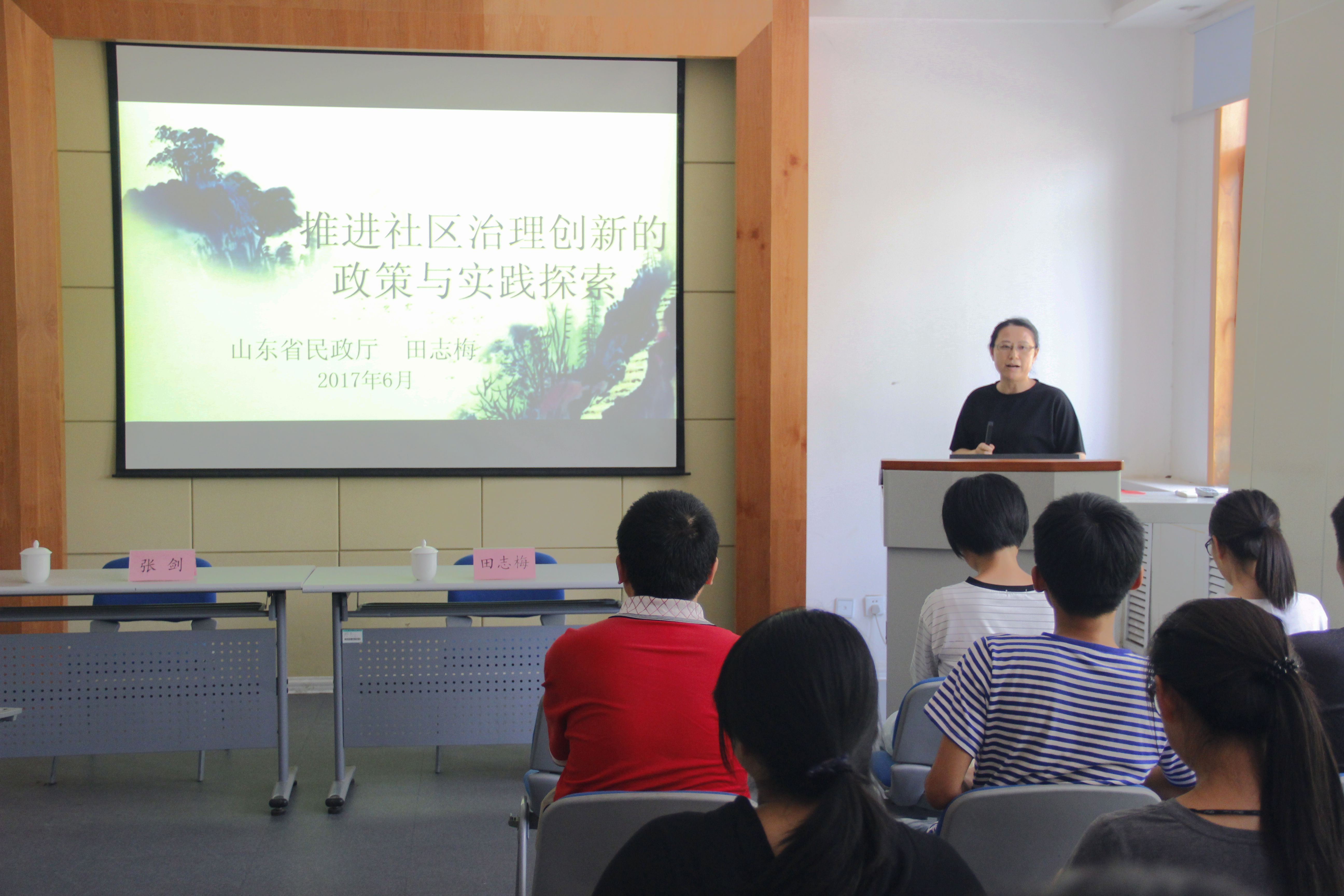 6月15日下午,由yl8858永利集团主办的第三期社区治理学术讲坛于文外楼个案室顺利举行。山东省民政厅基层政权和社区建设处副处长田志梅应邀做了题为《推进社区治理创新的政策与实践探索》的学术讲坛。2015级和2016级社会工作、老年服务与管理等专业的师生共同聆听了此次学术讲坛。会议由张剑主持。