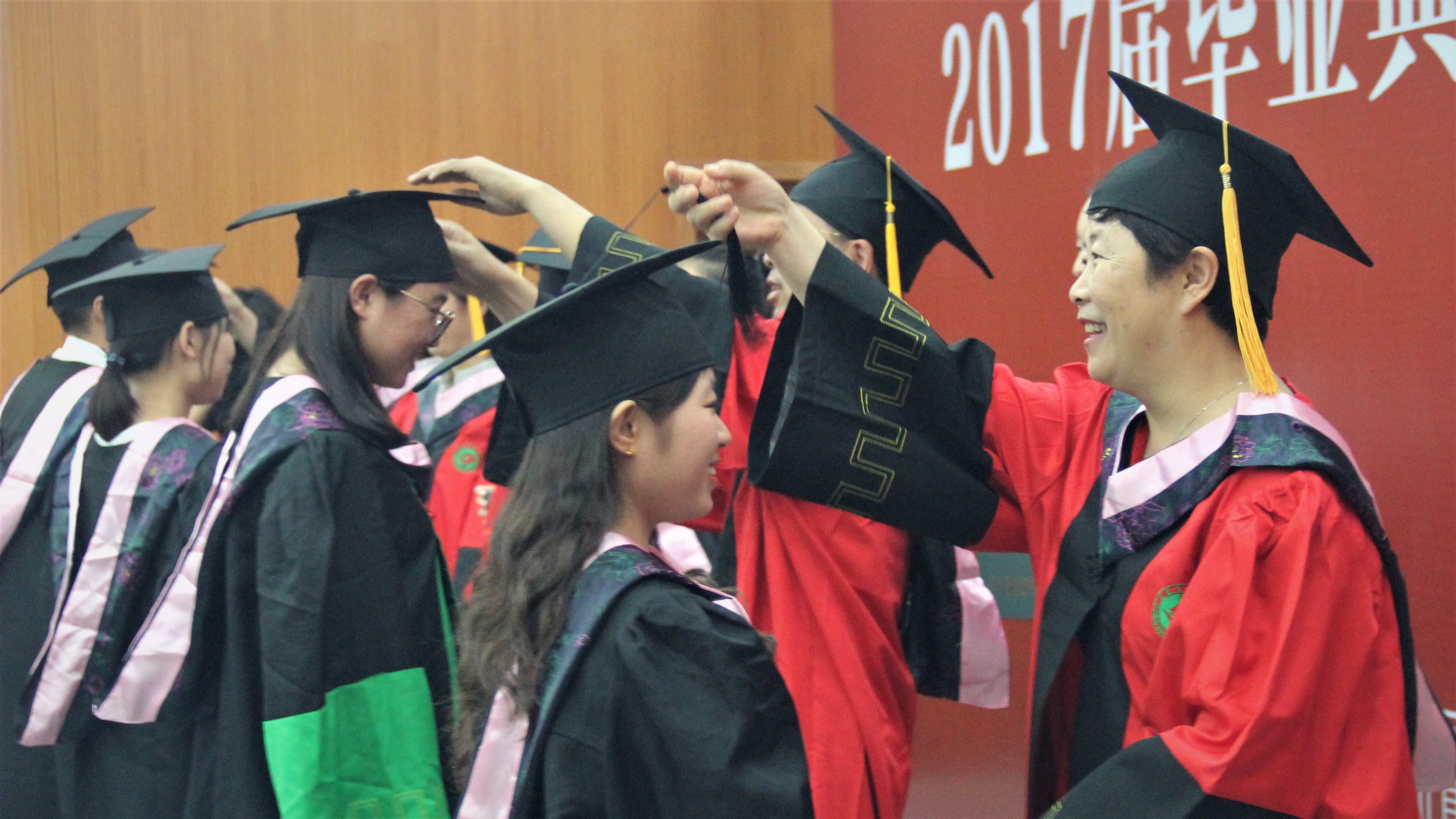 毕业典礼结束后,学位授予仪式开始。学院领导老师逐一为毕业生们颁发学位证书、扶正流苏并合影留念。