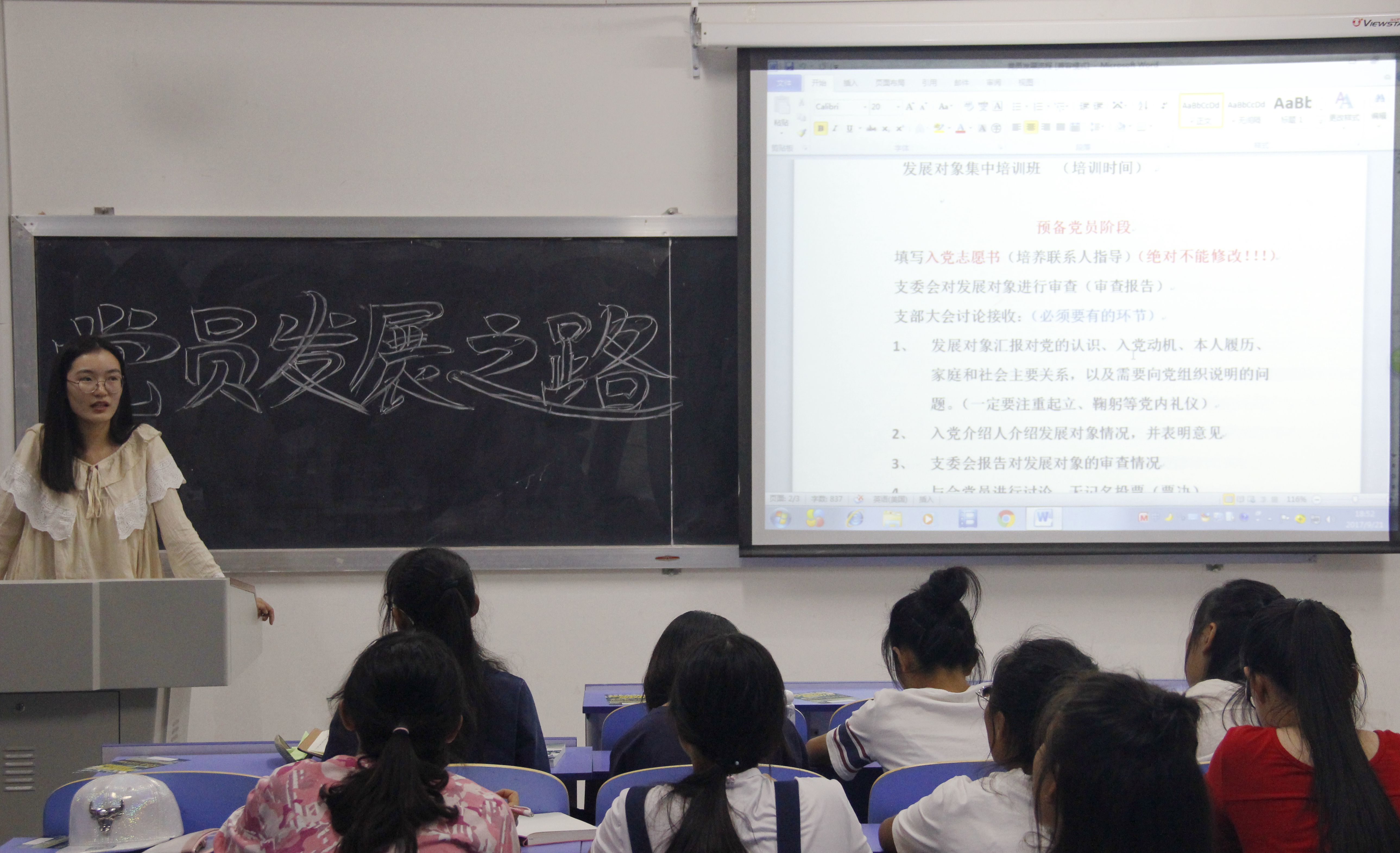 9月21日晚,政管学院学生党支部在各新生班级自习室举办了以“党员发展之路暨学生党员带班团”为主题的学生党员发展交流活动。活动以“党员发展‘1对1’精准培养”为宗旨,组织全体学生党员分别进入各自对接班级,与2017级新生分享入党历程和感悟。