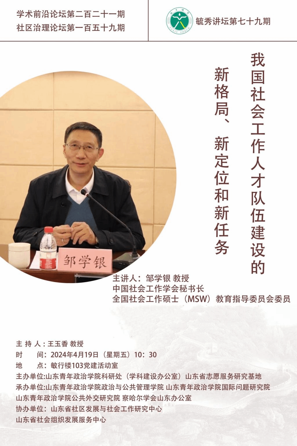 主讲人简介:邹学银教授,现任中国社会工作学会秘书长,全国社会工作硕士(MSW)教育指导委员会委员,全国慈善事业和社会工作标准化技术委员会副主任委员,兼任北京市思诚社区公益基金会名誉理事长,山东省、福建省社会工作专家库成员,上海市、广东省青少年事务社会工作智库成员等社会职务。主讲《社会学概论》《社会工作》《人类成长及环境》等课程。主持完成6项民政部委托课题和多项民政部与联合国儿童基金会合作项目。在老年社会学、社会工作、人类成长与环境等研究方向上进行了深入的研究,形成了一系列具有广泛影响力的学术成果。