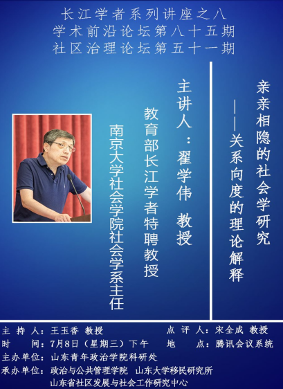 翟学伟,博士,教育部长江学者特聘教授(2015-2019)。曾任南京大学社会学院心理学系创系主任;现任南京大学社会学院社会学系主任。兼任中国社会心理学会副会长;《开放时代》、《中国社会心理学评论》、《本土心理学研究》(台湾)等学术刊物编委。长期致力于社会学与社会心理学的本土化研究。著有《中国人行动的逻辑》(三联书店2017年版);《中国人的关系原理》(北京大学出版社2011年版);《人情、面子与权力的再生产》(北京大学出版社2013年版);《中国人的脸面观》(桂冠图书公司1995年版,北京大学2013年版)等。曾主持国家社会科学基金重大招标项目“我国社会信用制度研究”;现为国家社会科学基金重大项目“儒家道德的社会化路径”首席专家。