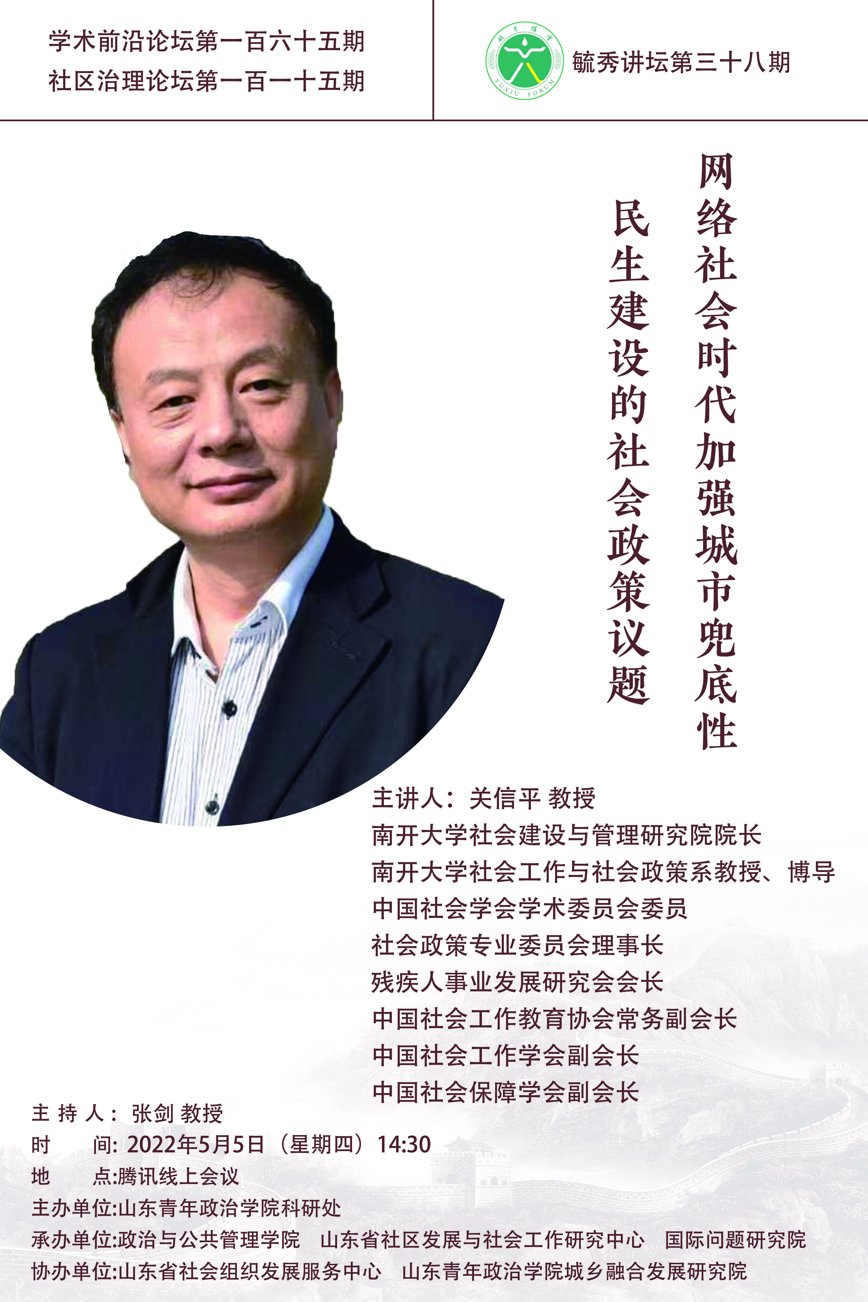 关信平,男,博士,南开大学社会建设与管理研究院院长,南开大学社会工作与社会政策系教授,博士生导师。兼任中国社会学会学术委员会委员及社会政策专业委员会理事长、残疾人事业发展研究会会长、中国社会工作教育协会常务副会长、中国社会工作学会副会长、中国社会保障学会副会长等学术社团职务。主要学术领域是社会政策、社会工作、社会保障。主持过国家社会科学基金重大课题、重点课题和一般项目、国家自然科学基金项目、多项教育部哲学社会科学研究重大课题攻关项目等科研项目。担任过马工程教材项目第一首席专家,出版过多部专著和教材,在国内外学术刊物上发表200多篇论文。曾获教育部人文社会科学研究优秀成果二等奖,天津市哲学社会科学研究优秀成果一等奖和其他多项省部级科研奖励。