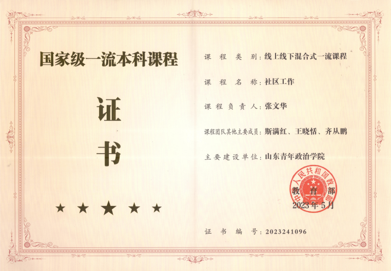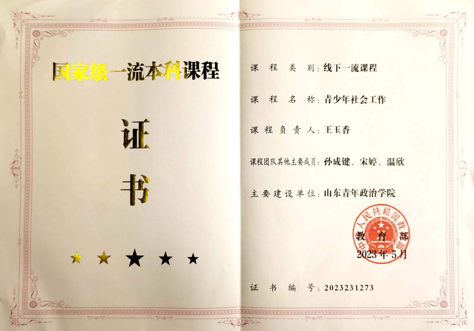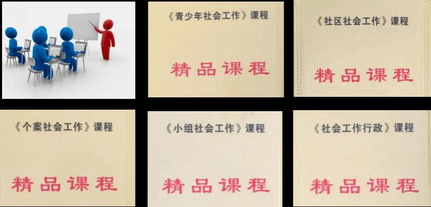 其中,《青少年社会工作》等5门课程被评为省级精品课程,《青少年社会工作》《社区工作》获评国家级一流课程、《青少年社会工作》《社区工作》《小组工作实践》和《恋爱心理与自我成长》等省级一流课程,《个案工作》《小组工作》获评校级一流课程。《青少年社会工作》《社区社会工作概论》《社会工作行政》《社会心理学》《恋爱心理与自我成长》获评省级在线开放课程。